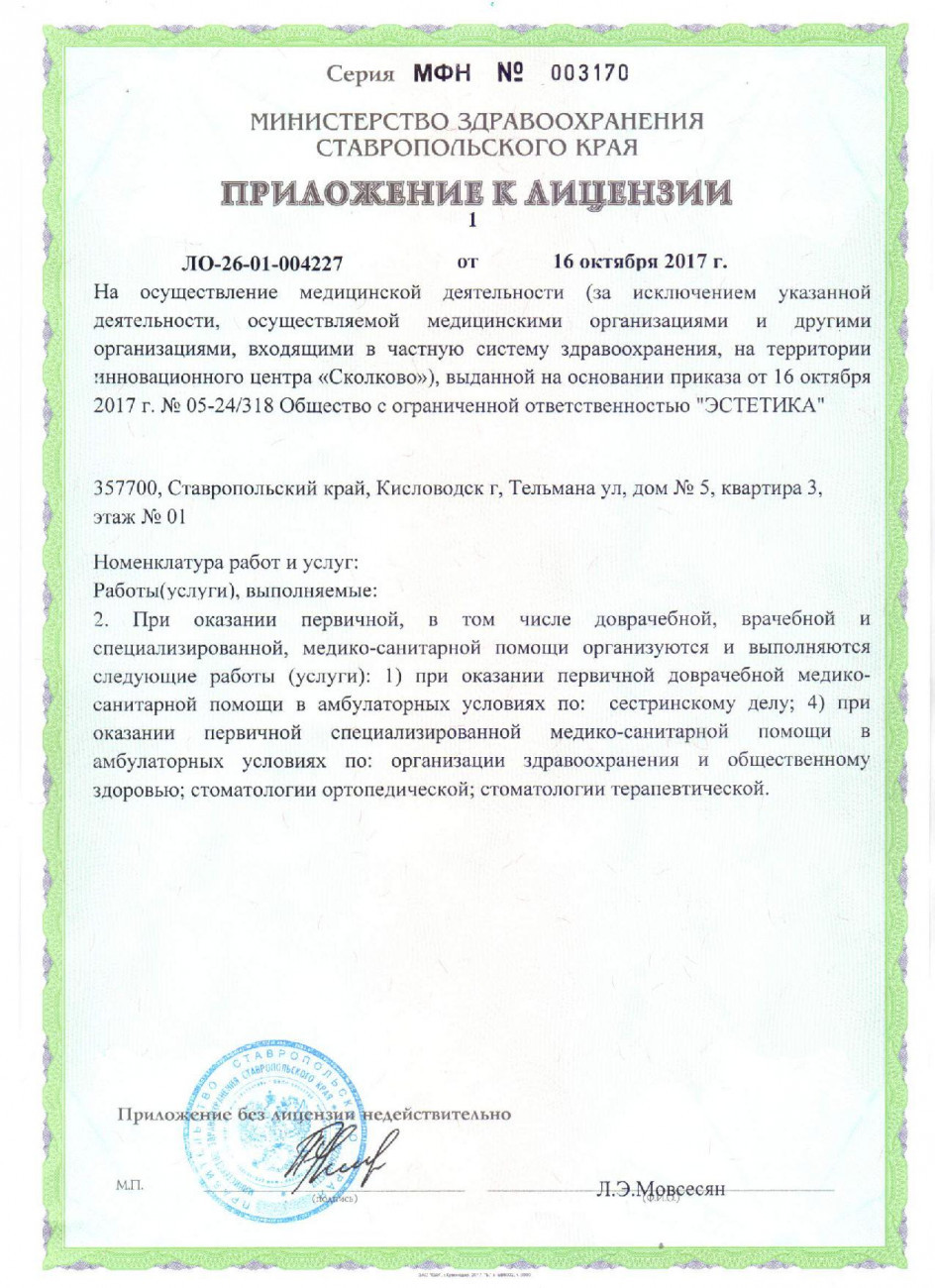 «Эстетика» во всем! Безупречный профессионализм, более чем 10-летний опыт работы в отрасли, стремление развиваться и шагать в ногу с прогрессом объединили наших высококлассных стоматологов в дружную команду под названием ООО «Эстетика». Наша стоматологическая клиника уютно расположилась в жилом районе Кисловодска на ул. Куйбышева 34А